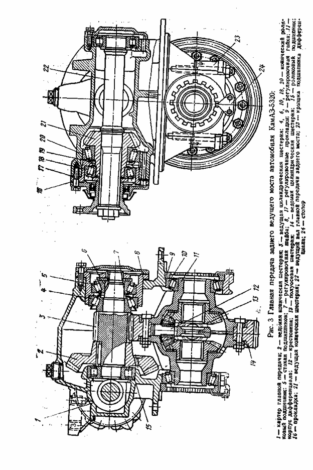 При этом благодаря незначительному внутреннему трению равенство моментов практически сохраняется как при неподвижных сателлитах, так и при их вращении. Поворачиваясь на шипах крестовины, сателлиты обеспечивают возможность вращения правой и левой полуосей, а следовательно, и колес с разными частотами. 2.2. Устройства и работа двойной главной передачи заднего ведущего моста автомобиля КамАЗ-5320Общее устройство главной передачи заднего ведущего моста (рис.3) аналогично рассмотренному выше. Отличия объясняются главным образом тем, что задний ведущий мост не проходной и получает крутящий момент от межосевого дифференциала, установленного на среднем ведущем мосту. В главной передаче заднего моста ведущая коническая шестерня 21 отличается от аналогичной шестерни среднего моста тем, что ее ступица короче и имеет внутренние шлицы для соединения с ведущим валом 22 главной передачи заднего моста. Опорные конические роликовые подшипники 18 и 20 взаимозаменяемы с соответствующими подшипниками среднего ведущего моста. Ведущий вал главной передачи заднего моста задним концом опирается на один роликовый подшипник, установленный в расточке картера. Для циркуляции смазки около подшипника в горловине картера имеется канал. С торца подшипник закрыт крышкой. Остальные детали главной передачи среднего и заднего ведущих мостов аналогичны по устройству.