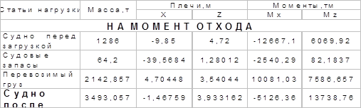 На основании выполненного распределения запасов и грузов составляем таблицу сводных данных и расчета водоизмещения с указанием координат центра тяжести судна. Эти расчеты представлены в таблице 3.5. Таблица 1.3 – Расчет водоизмещения