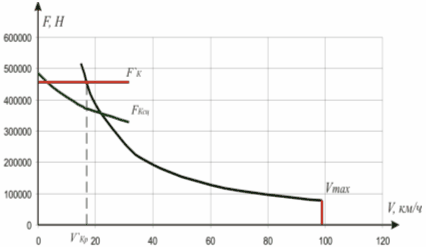 Рисунок 3 – Вид предварительных ограничений тяговой характеристики проектируемого тепловоза – ограничение мощности тепловоза из-за недоиспользования максимального тока ЭПМ. 3 Построение рациональной тяговой и технико–экономических характеристик 3.1 Определение рациональной величины передаточного отношения тягового редуктора Соотношение значений