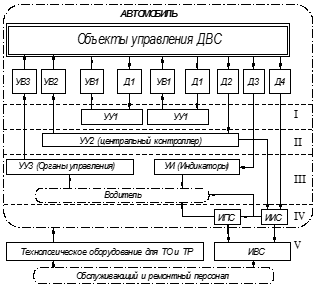 Рисунок 3.1 - Многоуровневая структура управления ДВС. Рассмотрим уровни управления. I - автоматические локальные системы управления, состоящие из датчиков Д1, устройств управления УУ1 и устройств воздействия УВ1. Выполняют функции систем автоматического регулирования (CAP), автоматической защиты (САЗ), автоматической блокировки (САБ). На первом уровне используются локальные регуляторы таких параметров, как частота вращения коленчатого вала на холостом ходу, состав и концентрация веществ в отработавших газах и другие. II - централизованная система автоматического управления (САУ) с микропроцессорным контроллером УУ2. На контроллер поступают сигналы от датчиков Д2, обрабатывая которые, он формирует команды, поступающие на устройства воздействия УВ2. В настоящее время системы управления топливоподачей и зажиганием объединяются в одну централизованную систему управления. На микропроцессорный контроллер возлагаются функции управления топливоподачей, зажиганием и пуском ДВС. III - автоматизированная система управления. Состоит из информационных систем (устройства контроля и измерения УИ с соответствующими индикаторами), и командных систем, включающих в себя различные средства автоматизации (ДЗ, УВЗ) с устройствами управления УУЗ и соответствующими органами управления. IV - систему управления состоянием ДВС (работой в процессе эксплуатации). Диагностическая система состоит из информационно-измерительной системы ИИС, собирающей информацию о состоянии узлов, агрегатов и систем с помощью датчиков Д4. Информационно-поисковая система (ИПС) накапливает в своей базе данных информацию о состоянии объектов в процессе их работы и выполняет предварительную обработку полученной информации. Информационно-вычислительная система (ИВС) путем обработки информации определяет техническое состояние объекта и место неисправности, если обнаруживается отклонение от нормального функционирования. V - система управления состоянием ДВС при техническом обслуживании. Здесь в качестве устройств воздействия выступает технологическое оборудование, используемое при проведении технического обслуживания (ТО) и текущего ремонта (ТР), управляющей подсистемой является обслуживающий и ремонтный персонал. Полученные с ИВС данные используются обслуживающим и ремонтным персоналом для выполнения работ по техническому обслуживанию и ремонту. Подробно системы управления рассматриваются в курсе "Информационные и микропроцессорные системы автомобилей". 3.1.2. Диагностирование МСУ ДВС. Программное обеспечение БУ содержит подсистему диагностики, позволяющую определять возникающие отказы (ошибки) в работе МСУ, в двигателе и фиксировать их в памяти ОЗУ. Информационно поисковая система может работать в следующих режимах: – считывание информации, записанной в память отказов и поступающей на индикатор диагностической системы с предварительной обработкой и выдачей кодов неисправностей; – проверка узлов и агрегатов на работающем или остановленном двигателе. Под отказом понимается выход контролируемых параметров за установленные границы, который говорит о наличии неисправности в работе МСУ или двигателя. Каждый сбой формализован, т.е. имеет свое определение и свой код неисправности [11]. При отсутствии неисправностей лампа диагностики (ЛД), в зависимости о