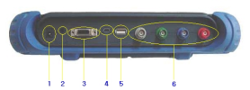 Рисунок 3.2 – Верхняя панель прибора. 1 – гнездо подключения питания; 2 – RS 232 коннектор; 3 – коннектор для подключения DLC кабеля; 4/5 – USB порт; 6 – порт для осциллографических шнуров Таблица 3.1 – Функции кнопок панели прибора.