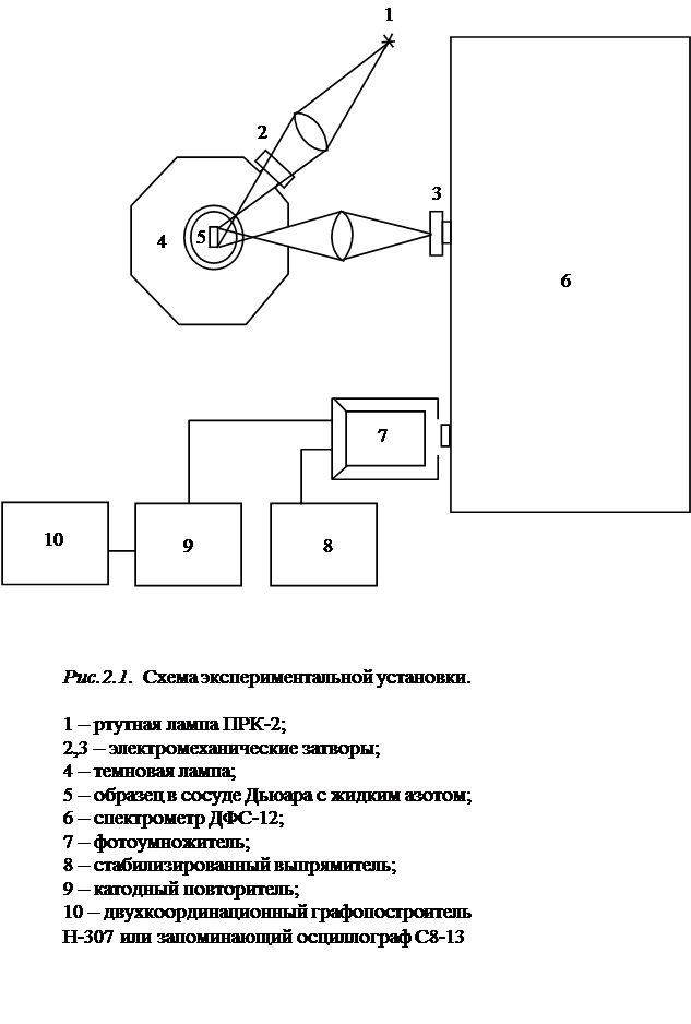 Ошибка в определении максимума 0-0 полосы в спектре сенсибилизированной фосфоресценции не превышала 5 При изучении кинетики сенсибилизированной фосфоресценции для отделения её от фосфоресценции донора использовались электромеханические затворы, управляемые с помощью электронных реле времени. Время срабатывания затворов не превышало 5 мс. Задержка во времени между началом регистрации сенсибилизированной фосфоресценции и прекращением возбуждения донора изменялась от 0,1 до 30 с. Регистрирующая часть установки включала в себя двухкоординатный графопостроитель Н-307 при записи спектров излучения и кинетики фосфоресценции молекул акцептора. При исследовании кинетики фосфоресценции молекул донора двухкоординатный графопостроитель заменялся на универсальный запоминающий осциллограф С8-13. Для согласования входного сопротивления самописца и выходного сопротивления фотоэлектронного умножителя использовался катодный повторитель, постоянную времени которого можно было изменять от 0,01 до 1,0 с. Линейность работы усилителя постоянного тока проверялась при подаче на ФЭУ светового потока регулируемого изменением входной щели монохроматора. Механическая постоянная времени графопостроителя не превышала 0,03 с. Кинетические кривые, полученные с помощью графопостроителя или осциллографа перестраивались в полулогарифмическом масштабе, из которого и определялось время разгорания или время затухания фосфоресценции. Величина погрешности при определении t в экспериментах обуславливалась флуктуациями фототока, нелинейностью усилителя, погрешностью блока временной развёртки и механической постоянной самописца. Три последних источника погрешностей по данным многократных проверок могли дать в сумме систематическую ошибку не более 1,0 %. Для уменьшения влияния флуктуаций фототока измерения повторялись 5-10 раз и общая ошибка в каждом конкретном случае находилась из среднего значения t с учётом возможной систематической ошибки. С учётом вышеизложенного, ошибка при измерении времени затухания сенсибилизированной фосфоресценции не превышала 0,05 с, а времени разгорания – 0,1 с. Большее значение ошибки при измерении времени разгорания обусловлено тем, что флуктуации светового потока источника света влияют на точность измерения времени разгорания и не влияют на точность измерения времени затухания. Ошибка при измерении времени затухания фосфоресценции донора не превышала 0,5 мс. В температурных исследованиях для уменьшения продольного градиента температуры кварцевая кювета помещалась в медную толстостенную трубочку. При этом для исследования с помощью диафрагмы выделялся участок высотой 2 мм, где находился в образце один из концов дифференциальной термопары. Толщина кюветы была равна 0,3 мм, диаметр – 2 мм. С целью уменьшения влияния поперечного градиента температуры контрольные опыты проводились в лопаточкообразной кювете, толщина исследуемого слоя в которой около 0,5 мм. Измерение температуры производилось с помощью медь-константановой термопары, проградуированной по точкам плавления н.-парафинов. Один спай термопары находился в сосуде Дьюара с жидким азотом, а второй помещался непосредственно в раствор перед замораживанием. В качестве измерительного прибора использовался гальванометр М-95, с ценой деления 0,01 мВ/дел. 