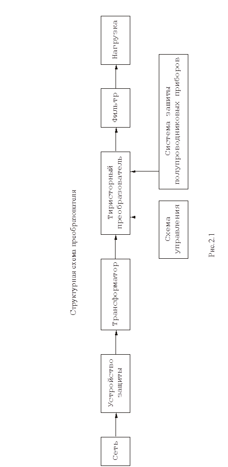Таким образом, наибольшее применение нашла мостовая схема Ларионова, содержащая выпрямительный мост из шести вентилей. 2. Разработка структурной и принципиальной схем преобразователя Основными элементами преобразователя являются трансформатор и вентили. Основное требование, предъявляемое к полупроводниковым преобразователям, в том числе и к выпрямителям - это надёжность, поэтому ввиду чувствительности приборов к перегрузкам, коротким замыканиям, перенапряжениям в схеме необходимо предусмотреть быстродействующие системы защиты. Необходимо выдерживать заданные параметры на выходе преобразователя. Для этого в схему включаются фильтры, датчики и системы сравнения выходных параметров преобразователей с заданными, и управления полупроводниковыми приборами. Согласно вышесказанному, составили структурную (рис. 2.1.) и принципиальную (рис. 2.2.) схемы полупроводникового выпрямителя.