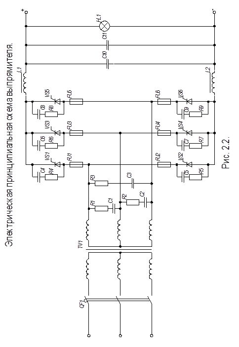 Uоп Uн,Iн Uзн-Ucу Uу Uу фн -Uc Uн УС – устройство синхронизацииГПН – генератор пилообразного напряжения К – компаратор Ф – формирователь импульсов У - усилитель УИ – усилитель импульсов ЗЧ – задатчик интенсивности Д - датчик АВ – автоматический выключатель В – выпрямитель ЗаключениеРезультатом расчета является трехфазный управляемый мостовой выпрямитель со следующими параметрами: a =27,585º – угол управления тиристоров; g = 37,979º – угол коммутации; Uн =32 В – выпрямленное напряжение. По данным расчета построили семейство внешних характеристик трёхфазного мостового выпрямителя во всём диапазоне нагрузок от холостого хода до короткого замыкания. Тиристоры выбирали по найденным значениям среднего тока, протекающего через тиристор и максимального обратного анодного напряжения. Исходя из этих условий, выбирали кремниевый тиристор Т133-400. Для сглаживания пульсаций выпрямленного напряжения до требуемого по техническому заданию уровня, Кп(6) = 0,024%, применили фильтр. Фильтр выполнен на конденсаторе К50-18 со следующими параметрами: номинальное напряжение Uном = 82 В; емкость конденсатора С = 51 мФ. Рассчитали дроссели, с индуктивность L1=L2=1,5×10-3 Гн, охлаждение дросселя водяное, подача воды осуществляется от насосной установки с перепадом давления Dр=3,775 атм. Рассчитали трёхфазный трансформатор стержневого типа с концентрическими обмотками, соединением «звезда-звезда» на полную мощность S =46,320 кВ·А, число витков первичной обмотки равно 52, а вторичной - 21. Для защиты от токов короткого замыкания и аварийных режимов работы выбрали плавкий предохранитель ПП57-3938 в цепь каждого тиристора из условия действующего значения анодного тока. В цепь первичных обмоток силового трансформатора выбрали выключатель А37-15. Литература 1. Бар В.И. Проектирование ведомых сетью статических преобразователей средней и большой мощности. – Тольятти: ТолПИ, 1994. – 79 с. 2. Замятин В.Я. и др. Мощные полупроводниковые приборы. Тиристоры. Справочник. – М.: Радио и связь, 1987. – 324 с. 3. Полупроводниковые приемно-усилительные устройства. Справочник радиолюбителя. – Киев.: Наукова Думка, 1982. – 672 с. 4. Тихомиров П.М. Расчет трансформаторов. – М.: Энергоатомиздат, 1986. – 543 с. 5. Намитоков К.К. и др. Аппараты для защиты полупроводниковых устройств. – М.: Энергоатомиздат, 1988. – 130 с. Перечень элементов