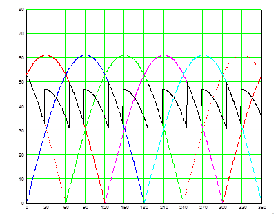 График кривых и постоянной составляющих выпрямленного напряжения.
