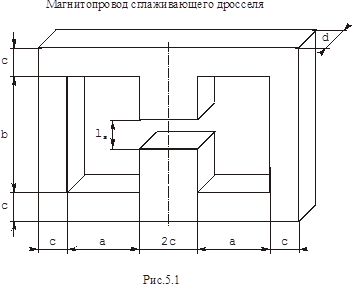 5.1.8 Выбор типа конденсатора. В качестве конденсатора С7 (рис.2.2) сглаживающего фильтра выбрали из справочника [3] конденсатор К50-18 емкостью 51 мФ (согласно ряда Е24) и номинальным напряжением Uном = 82 В. 5.2 Расчет сглаживающего дросселя Сглаживающий дроссель предназначен для уменьшения пульсаций выпрямленного тока. По обмотке дросселя протекают переменная и постоянная составляющие выпрямленного тока. Постоянная составляющая создает поток вынужденного намагничивания сердечника дросселя. Индуктивность дросселя зависит от величины этого магнитного потока. Чтобы ослабить эту зависимость, в сердечнике делают немагнитные зазоры (рис. 5.1). Для расчета сглаживающего дросселя предварительно задались следующими параметрами: - коэффициент заполнения окна магнитопровода: Kм =0,25; - коэффициент, характеризующий отношение высоты окна магнитопровода к ширине окна: K1 =b/a=4; -