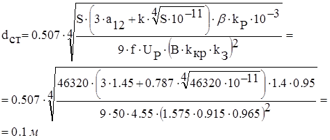 Получили B= 1.575 Тл, kЗ = 0.965, kКР = 0.915, k= 0.787, β= 1.4, a12 = 0.009 м. Приняли коэффициент приведения идеального поля рассеивания к реальному kР = 0.95. Рассчитали диаметр стержня по формуле: