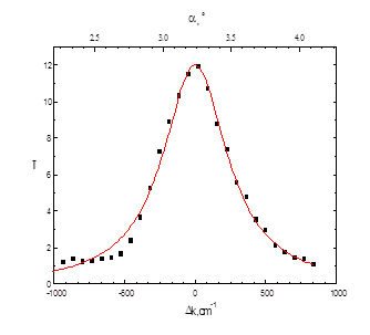 служать YAG: Nd+3-лазер і перебудований лазер на кристалі На виході спектрографа формувалася двовимірна частотно-кутова картина розсіяння. Відхилення світла по горизонталі відповідало частоті розсіяної хвилі, по вертикалі - куту розсіяння в площині хвилевих векторів накачувань. Пристрій касетної частини спектрографа дозволяє проводити як фотографічну, так і електронну реєстрацію сигналу. У останньому випадку приймачем сигналу служить Феу2, що працює в аналоговому режимі. Його сигнал через широкосмуговий підсилювач з регульованим коефіцієнтом передачі поступає в швидкодіючий стробований АЦП інтегруючого типу, такий, що входить до складу крейта КАМАК і далі в ЕОМ типу IBM PC/AT, що управляє. ЕОМ за допомогою блоків, що входять до складу крейта КАМАК, що управляє, здійснює синхронізацію і управління роботою окремих вузлів установки. У справжньому варіанті установки, при фотоелектронній реєстрації спектру, ФЕУ був нерухомий, і перед ним була поміщена щілина змінної ширини з мікрометричним гвинтом. Сканування спектру по частоті здійснювалося шляхом повороту призматичної частини спектрографа кроковим двигуном Шд1. Інший двигун Шд2 служить для повороту кристала в площині, що містить всі промені накачувань, що дає можливість змінювати розлад фазового синхронізму в зразку. Додатковий фотоприймач Феу1 служить для контролю потужності накачування. Використання переривника пробного променя ПЛ дозволяє автоматично віднімати фон, пов'язаний із засвіченням фотоприймача випромінюванням сумарної частоти двох інфрачервоних лазерів. Оптична схема установки орієнтована на реєстрацію стоксовой компоненти розсіяного випромінювання. Це дозволяє легко переходити від спостереження спонтанного трьох фотонного розсіяння світла на поляритонах до спостереження розсіяння на когерентно збуджених станах середовища простим включенням ГИК накачувань, оскільки в обох випадках розсіяне випромінювання лежить в одному частотно-кутовому інтервалі. Розділ 4. Дослідження характеристик кристалів методом активної спектроскопії Чотирьох хвильове розсіяння світла збуджувалося в кристалах ніобіту літію, легованих магнієм Mg: LiNbO3 з концентрацією домішки Мg 0.68масс.% і 0.79масс.% (кристали No.4,5). Дані за показниками заломлення у видимій і ближній ГИК області для кристала No.4 були отримані шляхом інтерполяції даних для кристалів No.3,5. У експерименті збуджувався поляритон в околицях частот 541см-1, 550см-1, 558.5см-1, 560см-1. Для цього для кожного вибраного значення частоти поляритону w P встановлюється частота генерації перебудованого лазера w 2 відповідно до другого рівняння з (12). Потім промені ГИК накачувань прямували на кристал під фіксованими кутами 1 qі 2 qдо напряму розповсюдження зондуючого накачування. Далі вимірювалася залежність інтенсивності сигналу на частоті S=L-1+2wwwвід кута повороту кристала aв площині хвилевих векторів накачувань. Спектральна ширина ліній накачувань складала приблизно 1см-1 для випромінювання основної і другої гармонік YAG:Nd+3-лазера і не більше 6см-1 для перебудованого лазера. Ширина ліній сигнального випромінювання, що народжувалося, повністю відповідала частотній структурі накачувань. Пікова потужність накачувань на вході в кристал: пробної хвилі ~0.25 Мвт, першого збудливого променя ~0.05 Мвт, другого збудливого променя ~0.01 Мвт. У експерим