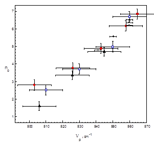 Мал.22. Дисперсія поляритонов, зміряна по трьох хвильовій і чотирьох хвилевій методиці для кристалів ніобіту літію з концентрацією домішки магнію: 0.41масс.% s; 0.68масс.% l; 0.79масс.% . Висновок У роботі досліджувалися кристали ніобіту літію з різною концентрацією магнію. При цьому використовувалися метод спонтанного параметричного розсіяння і чотирьох хвильове зміщення. 1. Отримані залежності показників заломлення у видимому і ближньому інфрачервоному діапазоні від концентрації домішки магнію. Концентрація домішки магнію мінялася в межах 0-1%. 2. Виявлена аномальна поведінка незвичайного показника заломлення в полідоменному кристалі. 3. Спостерігалася нелінійна дифракція при спонтанному параметричному розсіянні в полідоменном кристалі. Визначений період доменної структури в полідоменному кристалі методом СПР. 4. Отримані дисперсії звичайного показника заломлення на поляритонних частотах для кристалів з різною концентрацією домішки методом СПР. Проте, цей метод не дозволив виявити відмінності дисперсійних характеристик кристалів в дальній інфрачервоній області. 5. Зміряний звичайний показник заломлення на поляритоні фонона 580 см-1 для трьох концентрацій домішки магнію методом чотирьох хвильового зміщення. Цей метод дає набагато більшу точність, що дозволило виявити різницю в показнику заломлення для кристалів з різною концентрацією домішки магнію. 6. Розроблена методика чотирьох хвильового зміщення на когерентне порушуваних поляритонах. Список літератури 1. Д.Н. Клишко. Фотони і нелінійна оптика, Наука, М., 1980 р. 2. J.P. Coffinet and F. DeMartini. Phys.Rev.Lett. vol.22 №2, pp.60-64 (1969). 3. Д.Н. Клишко. Листи в ЖЕТФ, 6, 490, 1967. 4. Д.Н. Клишко, В.Ф. Куцов, А.Н. Пенін, Б.Ф.Полковников. ЖЕТФ, 62 1846, 1972. 5. Ф. Цернике, Д. Мідвінтер. ”Прикладна нелінійна оптика”. “Мир”; М.; 1976. 6. А.Л. Александровський, Г.Х. Китаєва, С.П. Кулік, А.Н. Пенін. “Нелінійна дифракція при параметричному розсіянні світла”.ЖЭТФ, 63, 613-615, 1986. 7. А.Л. Александровський, П. Посмикевіч, І.А. Яковльов. ФТТ, 25, 1199, 1983. 8. A.L. Aleksandrovski, I.I. Naumova, V.V. Tarasenko. Ferroelectrics, 141, 147-152, 1993. 9. А.Л. Александровський, О.А. Гліко, І.І. Наумова, В.І. Прялкин. “Лінійна і нелінійна дифракційні грати в монокристалах ніобіту літію з періодичною доменною структурою”. Квантова електроніка, т.23 №7, с. 1-3, 1996. 10. А.Л. Александровський, Г.І. Ершова, Г.Х. Китаєва, С.П. Кулік, І.І.Наумова, В.В. Тарасенко.”Дисперсия показників заломлення в кристалах LiNbO3:Mg і LiNbO3:Y”. Квантова електроніка, 18, 254-256, фев., 1991. 11. Г.М. Георгиев, Г.Х. Китаєва, А.Г. Міхайловський, А.Н. Пенін, Н.М. Рубініна. Фіз. Твердий. Тіла (Ленінград), 16, 3524, 1974. 12. Д.Н. Клишко, А.Н. Пенін, Б.Ф. Поліванов. “Параметрична люминисценция і розсіяння світла на поляритонах”. Листи в ЖЕТФ, 2, 11-14, 1970. 13. Winter F.X, Claus R. OpticCommunication, 6, 22-25, 1972. 14. Ю.Н. Поліванов, А.Т. Суходольський. “Спостереження інтерференції прямих і каскадних процесів при активній спектроскопії поляритонов”. Листи в ЖЕТФ, 25, 240-244, 1977. 15. В.Л. Стріжевський, Ю.Н. Яшкир. Квантова електроніка, т.2 №5, стр.995, 1975. 16. F. DeMartini, G. Giuliani, P. Mataloni, E. Palange and Y.R. Shen. Phys.Rev.Lett. vol.37 №7, pp.440-443, 1976. 17. G.M. Gale, F. Vallee, and C. Flitzanis. Phys.Rev.Lett. vol.57 №15, pp.1867-1870, 1986. 18. Ахманов С.А., Коротєєв Н.І. “Методи нелінійної оптики в спектроскопії розсіяння світла”. с. 38, 1981. 19. Д.Н. Клишко. Квантова електроніка, т. 2, 2, с. 265-271,1974. |