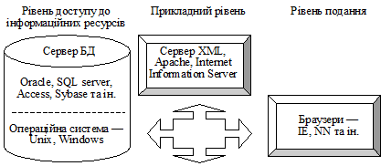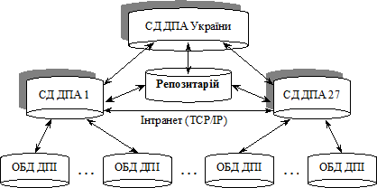 Рис. .1. Модель трирівневої архітектури Окремі подання найчастіше розміщують на персональних комп’ютерах, а прикладні додатки (інша назва — сервер прикладних програм) виконуються серверами середнього рівня під керуванням операційних систем Unix або Windows NT. Засоби доступу до даних і самі БД розміщуються або на потужному Unix-сервері, або на великих мейнфреймах. Концепція автоматизованої інформаційно-аналітичної системи ДПС України передбачає використання трирівневої архітектури клієнт—сервер. Основним напрямом удосконалення інформаційного забезпечення ДПС є розроблення та запровадження архітектури єдиної розподіленої БД, яка охоплюватиме сховище даних ДПА України, сховище даних ДПА в областях, оперативні бази даних державних податкових інспекцій (ОБД ДПІ) в районах. (рис. 6.2). Як бачимо, БД районного рівня та СД обласного і державного рівнів пов’язані між собою єдиним депозитарієм і інформаційними потоками. Репозитарій — це звичайна БД, де зберігаються системні дані, словники даних, довідники, що являють собою у сукупності метадані. Запровадження розподілених сховищ даних у ДПС України дає змогу: реорганізувати процеси адміністрування податків за функціональним принципом при суттєвому зниженні трудовитрат персоналу на виконання рутинних інформаційних процедур, таких як підготовка і зведення аналітичних і статистичних звітів; звести до мінімуму, а з часом і повністю виключити дублюючі операції з паперовими документами, виконання трудомістких обслуговуючих і сервісних інформаційних операцій.