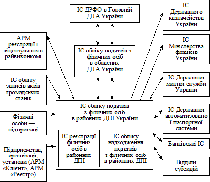 Рис. 3. Структурна схема інформаційної системиобліку податків з фізичних осіб у районній ДПІ Реєстрація фізичних осіб, які не є суб’єктами підприємницької діяльності і які мають доходи не за місцем основної роботи, виконується через введення інформації з форми № 2 «Довідка про одержані доходи та сплачені податки за виконання робіт за сумісництвом, за договорами цивільно-правового характеру, разових та інших робіт, дивіденди, авторські винагороди, за відповідний період часу». У результаті реєстрації відкриваються картки особового рахунка фізичної особи як платника відповідних податків і ведеться оперативний облік податків фізичних осіб. Оперативний облік підприємницької діяльності ведеться в розрізі податків і зборів, а саме — прибутковий податок, податок на додану вартість, акцизний збір, торговий патент, фіксований патент, єдиний податок. Підприємці, які є суб’єктами підприємницької діяльності, всі необхідні звітні документи (незалежно від наявності результатів діяльності) подають до канцелярії податкової інспекції, де вони проходять реєстрацію. У майбутньому звітні документи реєструватимуться за допомогою АРМ «Звіт» подібно до юридичних осіб, які за допомогою цього комплексу можуть здавати звітність в електронній формі. По закінченні реєстрації та проходження контролю звітні документи підприємців спрямовуються у відділ оподатковування фізичних осіб, де за допомогою АРМ «Облік податків і платежів» виконуються квартальні або річні розрахунки та нарахування прибуткового податку з подальшим друкуванням повідомлень-квитанцій для його сплати. Усі інші податки нараховуються самими підприємцями і супроводжуються на АРМ «Облік податків і платежів» подібно до технологій обліку платежів для юридичних осіб.