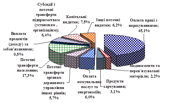 Рис. 7 - Структура видатків місцевих бюджетів за функціональною класифікацією у 2009 році У структурі видатків місцевих бюджетів за функціональною класифікацією порівняно з даними 2008 року найбільші зміни відбулися за видатками на соціальний захист та соціальне забезпечення, частка яких зросла на 2,9 в. п. і становить 20,2 %, та видатками на економічну діяльність, де спостерігається зменшення питомої ваги на 4,6 в. п. до 4,8 %. Частка видатків місцевих бюджетів на житлово-комунальне господарство зменшилась на 1,0 в. п. щодо показника попереднього року і склала 5,3 % [2]. Відбулось зростання часток видатків на охорону здоров’я (на 2,0 в. п. до 21,5 %) та на освіту (на 2,5 в. п. до 31,8 %). Частка трансфертів, що передаються з місцевих бюджетів до державного, залишилась на рівні 2008 року і становить 5,8 % усіх видатків місцевих бюджетів. Коштів, що передаються з місцевих бюджетів до державного бюджету, було перераховано у сумі 7,3 млрд. грн., або 97,8 % від запланованого показника на рік. У розрізі економічної класифікації за підсумками 2009 року 79,9 % усіх видатків місцевих бюджетів припадає на захищені статті (див. рис. 8), що більше за відповідний показник попереднього року на 9,5 в. п.