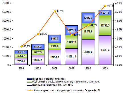 Рис. 8 - Структура видатків місцевих бюджетів за економічною класифікацією у 2009 році Суттєві зрушення у структурі видатків місцевих бюджетів пов’язані зі зменшенням частки капітальних видатків. Так, порівняно з показниками 2008 року вона скоротилася на 8,5 в. п. і склала лише 7,5 %. У номінальному вираженні капітальні видатки скоротились більше ніж удвічі та склали 10,0 млрд. грн. Видатки на оплату праці з нарахуваннями традиційно є найбільшими серед усіх видатків місцевих бюджетів і становлять 45,1 %, що на 4,7 в. п. перевищує відповідний показник 2008 року. Також спостерігається збільшення на 2,2 в. п. частки видатків на поточні трансферти населенню (до 17,3 %) та на 1,5 в. п. частки видатків на оплату комунальних послуг та енергоносіїв (до 6,0 %) [2]. Таким чином, органи місцевого самоврядування мають в 2,4 разу більше бюджетних зобов’язань, аніж отримують доходів. В основі такого становища лежать як недостатність власних джерел надходжень, так і неврегульованість механізму надання міжбюджетних трансфертів . Власними доходними джерелами (кошик № 2) забезпечується близько 20 % доходів місцевих бюджетів. Натомість, закріпленими податками та зборами (кошик № 1) забезпечується до 80 % доходів. Якщо врахувати, що трансфертами забезпечується близько 45 % доходів, то виявляється, що частка доходів, на мобілізацію яких органи влади мають вплив, складає приблизно 11 %. Це автоматично звужує автономність фінансової політики органів місцевого самоврядування. 2. Зростання частки трансфертів і частки дотацій вирівнювання. У структурі доходів місцевих бюджетів постійно зростає частка трансфертів: від 34,1 % у 2003 р. до 44,5 % у 2008 р. (рис. 11). За планом на 2009 р., їх доля має складати 54,8 % в загальних доходах бюджетів місцевого самоврядування (за підсумками першого півріччя вона склала 41,3 %). До місцевих бюджетів з державного бюджету протягом 2009 року надійшло 62,2 млрд. грн. міжбюджетних трансфертів (97,8 % річного плану), що більше за обсяги таких надходжень у 2008 році на 5,2 %. Унаслідок цього збільшилася частка міжбюджетних трансфертів у загальній структурі доходів місцевих бюджетів – 46,7 % проти 44,5 % за результатами 2008 року [2]. У структурі трансфертів найбільшу частку складає дотація вирівнювання - 53,6 %, що на 4,9 в. п. більше за аналогічний показник 2008 року.
