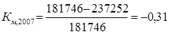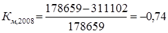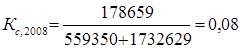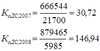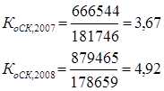 Полученные значения коэффициентов значительно превышают норматив – 0, 7. Это означает, что организация не обладает достаточным запасом финансовой устойчивости и почти полностью зависит от внешних финансовых источников. На предприятии наблюдается ухудшение финансовой устойчивости, так как за 2008 год данный коэффициент возрос в 2 раза. 3) Коэффициент самофинансирования: показывает какая часть деятельности финансируется за счет собственных, а какая - за счет заемных средств.