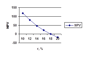 Рисунок 2.2 – График нормы рентабельности инвестиций IRR= r1 + NPV1 *(r2 – r1 )/ (NPV1 – NPV2 ), где r1 = 17%, r2 = 18%, NPV1 = 9,62, NPV2 = - 0,81. Рассчитаем норму рентабельности инвестиции (IRR): IRR = 17 + 9,62*(18 – 17) / (9,62 + 0,81) = 17,92 % ~ 18% Расчет внутренней нормы доходности инвестиций IRR производился методом последовательных итераций. В результате чего было определено, что при ставке дисконтирования 18 % NPV принимает нулевое значение, следовательно, IRR = 18 % (см. Приложение Г, таблица 1.4). Таким образом, предприятие может использовать ресурсы для финансирования проекта, стоимость, которых будет менее 18%, только в этом случае целесообразно реализовывать Проект. Поскольку, Проект на 75 % финансируется за счет кредитных ресурсов коммерческих банков, то IRR показывает верхнюю границу допустимого уровня банковской процентной ставки, превышение которого делает проект убыточным, поэтому целесообразно сравнить значение IRR со средней ставкой процента по кредитам. Среднюю процентную ставку по кредитным ресурсам можем найти по формуле 1.7. С учетом всех расходов, связанных с организацией и обслуживанием кредитных ресурсов, средняя расчетная ставка по кредитам составит 6 % годовых (см. Приложение Б). Таким образом, IRR > CC следовательно, планируемые кредитные ресурсы являются привлекательными и могут быть использованы для финансирования Проекта. Таким образом, данный финансовый показатель также свидетельствует о приемлемости Проекта. - Метод периода окупаемости. Поскольку прибыль от реализации проекта распределена неравномерно, то срок окупаемости рассчитывается прямым подсчетом числа лет, в течение которых инвестиция будет погашена кумулятивным доходом (см. приложение Г, таблица 1.5). Построим график: