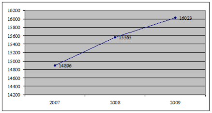 Рис.8. Физические лица, осуществляющие предпринимательскую деятельность в РМЭ, за 2007-09 гг. Количество физических лиц, осуществляющих предпринимательскую деятельность (индивидуальных предпринимателей), составило в 2009 году 15961 человек, что на 1384 человек, или на 9,5% больше, чем в 2007 году. На территории Республики Марий Эл в качестве индивидуальных предпринимателей действуют 15867 граждан Российской Федерации и 75 иностранных граждан. 19 физических лиц действуют в качестве индивидуальных предпринимателей, не достигнув совершеннолетнего возраста. Количество организаций - юридических лиц, состоящих на учете по месту своего нахождения, на 01.01.2010 года составило 16023, что на 1127 организацию, или на 7,6% больше по сравнению с 2007 годом (рис.9).
