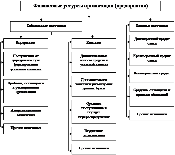 Рисунок 2 - Состав финансовых ресурсов организации Чтобы предприятие могло осуществлять хозяйственную деятельность, необходимо наличие соответствующего финансового обеспечения. Одним из основных источников финансовых ресурсов предприятия является первоначальный капитал, который формируется из вкладов учредителей предприятия и принимает форму уставного капитала. Следовательно, уставный капитал - это зафиксированная в учредительных документах общая стоимость активов, которые являются взносами собственников в капитал предприятия. Уставный капитал является основной частью собственного капитала и основным источником собственных финансовых ресурсов предприятия. Способы образования уставного капитала зависят от организационно-правовой формы предприятия. Средства уставного капитала направляются на приобретение основных фондов и формирование оборотных средств в размерах, необходимых для ведения нормальной производственно-хозяйственной деятельности. Он может также расходоваться на приобретение лицензий, патентов, ноу-хау и т.п. Первоначальный капитал, инвестированный в производство, создает стоимость, выражающуюся в цене реализованной продукции. После реализации продукции она принимает денежную форму — форму выручки. Однако выручка — это еще не доход, хотя и является источником возмещения затраченных на производство продукции средств и формирования денежных фондов и финансовых резервов предприятия. В процессе использования выручка делится на качественно разные составные части. Одно из направлений использования выручки — формирование амортизационного фонда. Он образуется в виде амортизационных отчислений после того, как износ основных производственных фондов и нематериальных активов примет денежную форму. Обязательным условием образования амортизационного фонда является продажа произведенных товаров потребителю и поступление выручки. Создавая товар, предприятие расходует сырье, материалы, покупные комплектующие изделия и полуфабрикаты. Их стоимость наряду с другими материальными затратами, износом основных производственных фондов, заработной платой работников составляет издержки предприятия по производству продукции, принимающие форму себестоимости. До поступления выручки эти издержки финансируются за счет оборотных средств предприятия, которые не расходуются, а авансируются в производство. После поступления выручки от реализации товара оборотные средства восстанавливаются, а понесенные предприятием издержки по производству продукции возмещаются. Обособление издержек в виде себестоимости дает возможность сопоставить полученную от реализации продукции выручку и производственные затраты. Смысл инвестирования средств в производство продукции состоит в получении чистого дохода, и если выручка превышает себестоимость, то предприятие получает его в виде прибыли. Как прибыль, так и амортизационные отчисления являются результатом кругооборота средств, которые были вложены в производство, и собственными финансовыми ресурсами предприятия, которыми оно распоряжается самостоятельно. Полученная предприятием прибыль не остается полностью в его распоряжении: часть ее в виде налогов поступает в бюджет. Прибыль, остающаяся в распоряжении предприятия является главным источником фин