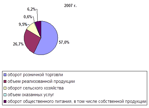 Данные таблицы 2 показывают, что динамика объёма оборота в сопоставимых ценах показывает, что совокупный оборот в 2006 году составил 101,2 % к уровню оборота 2005 года, а в 2007 году – 106,6 % к уровню 2006 года. В 2006году по сравнению с 2005 годом оборот розничной торговли в сопоставимых ценах увеличился на 11,1 %, объем оказанных услуг – на 5,7 %, оборот сельского хозяйства – на 5,7 %. Однако резко снизился объем выпущенной и реализованной продукции, его объем снизился за этот период на 10,2 процентных пункта, а так же оборот общественного питания на - 7,3 %. Анализ объёмов деятельности райпо за 2007 год по сравнению с 2006 годом показывает, что совокупный оборот за анализируемый период увеличился на 6,6%, чему способствовало увеличение оборота розничной торговли на 14,7 %, объёма оказанных услуг – на 56,7 %, оборота сельского хозяйства – на 15,7 %. Однако, снизился за данный период оборот общественного питания на 2,1 %, также сократился оборот общественного питания по собственной продукции на 2,0%. Также сократился объем реализованной продукции – на 8,6 %. Чтобы наглядно изобразить изменение структуры оборотов по отраслям Кизнерского райпо за 2005 – 2007 гг. построим диаграмму (см. рисунок 5).