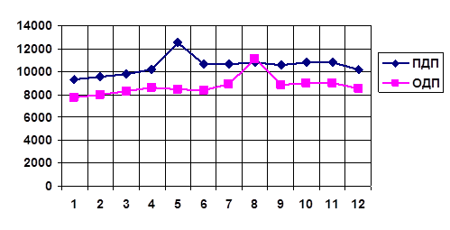 ![]() Рисунок 9 - График синхронизации денежных потоков за 2005 год. Приведенные на рисунке 7-9 данные наглядно показывают, в какие периоды у предприятия будет излишек денежных средств, а в какие – недостаток. Для оценки степени равномерности формирования и синхронности положительного и отрицательного денежного потока рассчитывают также среднеквадратичное отклонение, коэффициент вариации и коэффициент корреляции. Среднеквадратичное отклонение показывает абсолютное отклонение индивидуальных значений от среднеарифметического. Коэффициент вариации характеризует относительную меру отклонений отдельных значений от среднего уровня показателя. Коэффициент корреляции показывает степень синхронизации денежных потоков за анализируемый период времени. Используя компьютерные технологии рассчитаем коэффициенты вариации и корреляции. По Кизнерскому райпо коэффициент вариации в 2007 году для положительного денежного потока равен 4,9 %, а для отрицательного - 9,3 %. В 2006 году коэффициент вариации для положительного потока равен 4,2 %, а для отрицательного – 9,5 %. Коэффициент вариации в 2005 году для положительного потока составил 7,8 %, а для отрицательного – 9,4 %. Это относительно небольшой размах отклонений значений динамического ряда от среднего уровня исследуемых показателей. Чем ближе значение коэффициента корреляции к единице, тем меньше разрыв между значениями положительных и отрицательных потоков, из чего следует что, потоки синхронизированы по времени интервалов. Такой ситуации меньше риск возникновения дефицита денежных средств или избыточности денежной массы. И та и другая ситуация невыгодна для предприятия: дефицитный денежный поток приводит к неплатежеспособности, избыточный денежный поток обусловливает обесценение денежных средств в условиях инфляции, в результате чего уменьшается реальная величина собственного капитала. По Кизнерскому райпо коэффициент корреляции составил в 2007 году 0,59, в 2006 году 0,66, а в 2005 году всего 0,34. На основании чего можно сделать вывод, что положительные и отрицательные денежные потоки не достаточно хорошо сбалансированы по временным интервалам и предприятие в июле-августе испытывало дефицит денежных средств. А также на данном предприятии за два последних года коэффициент корреляции увеличился приблизительно в два раза, но в 2007 году уменьшился на 0,07 по сравнению с прошедшим годом. Рассчитывают и анализируют также динамику коэффициента ликвидности денежного потока. По Кизнерскому райпо данный коэффициент в 2007 году равен 1,2, в 2006 году - 1,16 и в 2005 году - 1,18, что способствует росту остатков денежных активов на конец периода, то есть повышению коэффициента абсолютной ликвидности предприятия. 3.2 Повышение эффективности использования финансовых ресурсов организации за счет диверсификации ее деятельности Важным фактором повышения финансово-экономической эффективности деятельности предприятия является достижение более полного и эффективного использования основных фондов – улучшение использования мощности предприятия, достигаемое на основе рационального использования производственных площадей, повышения коэффициента сменности и непрерывности работы цехов, в результате которых обеспечивается увеличение объема товарооборота; - улучшение использования машин и оборудования, совершенс