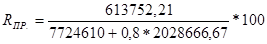 7.3 Расчёт показателей по рентабельности Рентабельность характеризуется двумя показателями: суммой прибыли и уровнем рентабельности. Различают прибыль от реализации (ПР ) и валовую или балансовую прибыль(ПВ ). Первая – результат реализации продукции, вторая учитывает и результат внереализационной деятельности: доходы от долевого участия в деятельности других предприятий, от сдачи имущества в аренду, по ценным бумагам и доходы (убытки) от других видов деятельности. В курсовой работе ПВ = ПР . ПР =NP -ЗР где ЗР – себестоимость реализованной продукции, руб. Так как N Р = N ТП , то ПР =NТП -ЗТП где ЗТП – себестоимость товарной продукции, руб. Пр =3043000–2429247,79=613752,21 руб. Величина прибыли(ПР ) должна быть сопоставима с П MAX , полученной во втором разделе курсовой работы. ПMAX =292672 + 321960 = 614632 руб. Уровень рентабельности характеризуется двумя показателями: рентабельностью производства (общей рентабельностью) и рентабельностью изделия. Рентабельность производства(R ПР ) определяется по формуле: