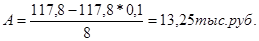 3. Чистые доходы и денежные потоки. 3.1 Доход от продаж при цене за 1 ед. продукции 124 тыс. руб. 1 год (4 год продаж) = 124*2000 = 248 тыс. руб. 2 год = 124*3000 = 372 тыс. руб. 3 год = 124*4000 = 496 тыс. руб. 4 год = 124*5000 = 620 тыс. руб. 5 год = 124*6000 = 744 тыс. руб. 3.2 Полная себестоимость (С) всего выпуска продукции. Затраты переменные на 1 ед. продукции – 44 руб. Затраты постоянные на весь выпуск – 45 тыс. руб. С1 = 2000*44+45000 = 133 тыс. руб. С2 = 3000*44+45000 = 177 тыс. руб. С3 = 4000*44+45000 = 221 тыс. руб. С4 = 5000*44+45000 = 265 тыс. руб. С5 = 6000*44+45000 = 309 тыс. руб. 3.3 Сумма годовых амортизационных отчислений. 3.4 Налог на прибыль (ставка налога - 30%). Нп1 = (248-133-13,25-17,64)*0,3 = 25,23 тыс. руб. Нп2 = (372-177-13,25-2,52)*0,3 = 53,77 тыс. руб. Нп3 = (496-221-13,25-1,26)*0,3 = 78,15 тыс. руб. Нп4 = (620-265-13,25)*0,3 = 102,53 тыс. руб. Нп5 = (744-309-13,25)*0,3 = 126,53 тыс. руб. 3.5 Остаточная стоимость оборудования: Сост = Сперв - Тс*А = 117,8–13,25*5 = 55,55 тыс. руб. Продажная стоимость: Сп = 1,1*55,55 = 56,71 тыс. руб. Табл.4. Денежные потоки для финансового планирования, тыс. руб.