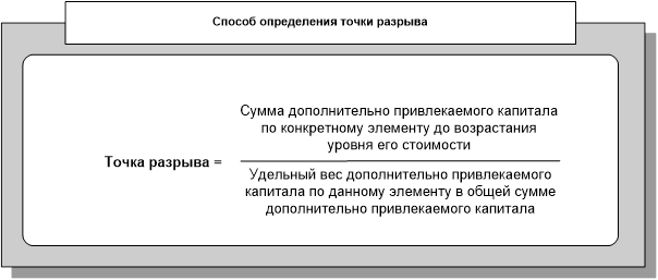 Приведенный график иллюстрирует скачкообразный характер изменения предельной стоимости капитала по отдельному его элементу по мере возрастания объема дополнительного его привлечения. Точка, в которой происходит каждый новый скачок уровня стоимости дополнительно привлекаемого капитала, называется «точкой разрыва». На представленном графике такими «точками разрыва» являются точки А, Б, В, Г и Д. Увеличение уровня стоимости привлечения каждой дополнительной единицы отдельного элемента капитала в «точке разрыва» приводит одновременно к росту средневзвешенной стоимости дополнительно привлекаемого капитала организации. Следовательно «точка разрыва» характеризует не только новый скачок уровня стоимости отдельного элемента капитала, но и границу перехода к новой средневзвешенной стоимости дополнительно привлекаемого капитала. С помощью «точки разрыва» можно определить, какая сумма дополнительного капитала может быть привлечена организацией, прежде чем возрастет предельная средневзвешенная стоимость капитала. Алгоритм этого расчета имеет следующий вид: