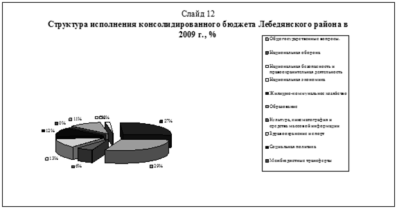 В 2009 г. расходы бюджета Лебедянского района имели выраженную социальную направленность. В общей сложности 60% расходов бюджета составляют расходы на финансирование мероприятий по культурно-социальной сфере, целевых программ района и поселений. Структура расходов бюджета показывает, что основными приоритетными направлениями в деятельности органов местного самоуправления в 2009 г. были сферы образования (29,4%) общих расходов консолидированного бюджета, здравоохранение и спорт (12,8%) и жилищно-коммунальное хозяйство (27,3%). Таблица 19 Итоги исполнения консолидированного бюджета Лебедянского района за 2009 г. по расходам