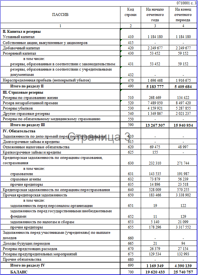За рассматриваемый период с 2006 по 2008 годы валюта баланса ЗАО «Страховая группа «Спасские ворота» увеличилась на 9483449 тыс. рублей, что свидетельствует о расширении деятельности организации. Наибольшую долю в составе активов занимают инвестиции, на долю которых в 2008 году приходилось 54,3% валюты баланса, еще 15,41% валюты баланса приходилось на долю перестраховщиков в страховых резервах, 11,4% на дебиторскую задолженность по операциям страхования, сострахования, а 7,6% - на долю основных средств (здания, транспортные средства и т.п.). За рассматриваемый период величина дебиторской задолженности увеличилась на 220882 тыс. рублей, что может свидетельствовать о расширении коммерческого кредита, предоставляемого организацией своим клиентам. За период с 2006 года величина основных средств увеличилась на 798066 тыс. рублей, что связано с покупкой помещений, транспортных средств для новых представительств ЗАО «Страховая группа «Спасские ворота». Рассмотрим далее источники формирования имущества ЗАО «Страховая группа «Спасские ворота» на основании аналитической таблицы, составленной по данным раздела «Пассивы» бухгалтерского баланса предприятия (приложения 1,2 )(таблица 2). Таблица 2.2 Анализ источников имущества ЗАО «Страховая группа «Спасские ворота» за 2006-2008 годы