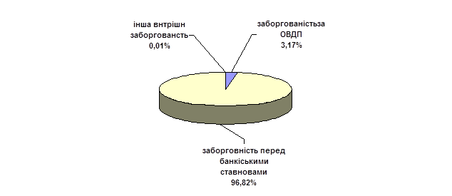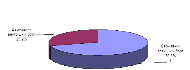 В 2000 році державний борг України становив 14,3 млрд. доларів США, з яких 70,8% припадає на зовнішній борг та 29,2% – на внутрішній (див. Рис. 2.1). Рис. 2.1. Структура державного боргу України, % Поняття державного внутрішнього боргу, його структури, види і форми, визначені Законом України про державний внутрішній борг, прийнятому у вересні 1992 року. До складу внутрішнього державного боргу згідно з Законом входять позичання уряду України і позичання, здійснені при безумовній гарантії уряду. До складу внутрішніх боргових зобов’язань уряду належать випущені облігації внутрішніх державних позик та одержані урядом кредити. До 1996 року внутрішній борг України формувався переважним чином внаслідок отримання прямих позик Національного банку для фінансування дефіциту державного бюджету. Структура внутрішнього боргу була затверджена законом лише в 1997 році. В січні 1997 року прийнято Закон України “Про структуру державного внутрішнього боргу України за станом на 1 січня 1996 року і граничний розмір державного внутрішнього боргу України на 1996 та 1997 роки ”. Сумарний обсяг державного внутрішнього боргу в Україні на 1 січня 1996 року становив 8 002 222 910 гривень, в тому числі заборгованість держави перед юридичними особами, включаючи заборгованість уряду за внутрішніми позиками становила 253 290 877 гривень, або 3,17% від загальної величини державного боргу (див. Рис. 2.2).