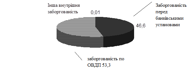 Рис 2.3. Динаміка зростання внутрішнього боргу УкраїниВнутрішній борг можна умовно поділити на боргові зобов’язання двох видів: ринкові, що існують у формі державних емісійних цінних паперів, та неринкові, що виникли за підсумками виконання державного бюджету, інших позиках та зобов’язаннях. До ринкових інструментів можна віднести облігації внутрішньої державної позики (ОВДП), облігації внутрішньої державної ощадної позики (ОВДОП) та казначейських векселів. Типовим прикладом неринкових інструментів державного внутрішнього боргу є заборгованість уряду Національному банку України. Сюди входить також заборгованість, що створилась в результаті компенсації гарантованих заощаджень громадянам України чи інших державних боргових сертифікатів, що в свій час були розміщені серед населення (речові облігації, тощо). Щодо державних цінних паперів, то доцільно взяти до уваги досвід Росїі, де емісія державних казначейських зобов′язань розпочалась на 2 роки раніше. Там обслуговування внутрішнього боргу стало основним дефіцитоутворюючим фактором. Підтримання піраміди державних казначейських зобов′язань стає можливим лише за рахунок її розширення, але його резерви вже майже вичерпано. Поточні зобов′язання за внутрішнім боргом складають 10% ВВП на місяць. Це означає, що, навіть якщо Федеральний бюджет припинить фінансування всіх видатків, крім обслуговування внутрішнього боргу, податкових надходжень без емісії державних цінних паперів для цієї мети не вистачить. Враховуючи темпи зростання емісії ОВДП в Україні, ставки їхньої дохідності, а також усе менші обсяги податкових надходжень, логічно припустити аналогічний до російського сценарій розвитку подій. В 2000 році внутрішній державний борг склав 22,8 млрд. гривень, з яких 12,2 млрд. гривень або 53,3% становила заборгованість по ОВДП (див.табл.2.3, рис. 2.4).