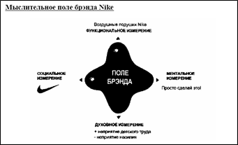 Рис. 1 Практическим примером этой модели является четырехмерная модель бренда Nike. Выпуская свою продукцию под слоганом «Просто сделай это», компания, которой принадлежит бренд Nike, аппелировала к ментальному измерению бренда, т.е. этот бренд направлен на «поддержку» потребителя (см. рис 2). Таким образом, бренд – это уникальное торговое предложение, обладающее специфичными атрибутами, выполняющими идентификационную, эмоционирующую и позиционирующую функции. Бренд легко узнаваем среди других предложений на рынке и аппелирует к актуальным ценностям общества и его можно оценить по четырем измерениям: функциональному, ментальному, социальному и духовному.