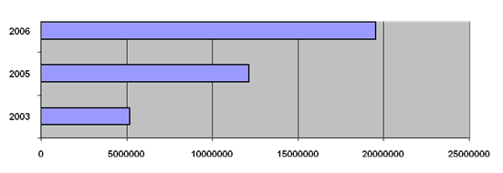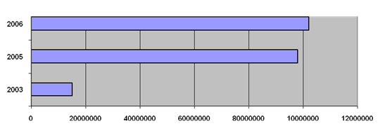 Рисунок 2 – График динамики валюты баланса «ОАО АК Барс» банка Общая сумма собственных средств банка за 1999-2003 гг. увеличилась на 698 358 тысяч рублей, к 2006 году – увеличилась по сравнению с 2003 годом на 86 985 677 тыс. рублей. Для анализируемого банка характерно, что в течении данных лет доля уставного фонда уменьшилась с 83% от общего объема собственных средств до 64,5%, но абсолютная сумма фонда изменилась всего на 15396 тысяч рублей. За 2002-2003 гг. доля прибыли в структуре собственных средств возросла более в 2 раза (с 8,54% до 17%), в абсолютной сумме на 300 000 тыс. рублей. За рассматриваемый период доля прибыли в структуре собственных средств возросла на 15% и в абсолютной сумме на 490 000 тысяч рублей. Таким образом, анализ структуры собственных средств банка показывает, что в связи со сложившейся благоприятной ситуацией для банка, произошло увеличение объема собственных средств, доминирующую часть собственных средств составляют различные фонды. За анализируемый период заметно улучшилось отношение населения к деятельности банка, возросло доверие населения – Рисунок 3 – показывает динамику вкладов за 2003 – 2006 года.