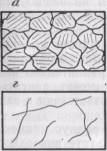 а)хорошо отсортированный высокопористый песчаник, б) плохо отсортированный песчаник, в) глины, г)трещиноватая карбонатная порода, при Кп =15%, д) Кп =30%, е) трещиновато-кавернозная карбонатная порода. По форме первичные полости—поры могут быть ромбоэдральными, у хорошо отсортированных рыхлых и скатанных песков, тетраэдрическими у тех же сильно уплотненных пород, щелевидными у глин, слюд и других минералов с кристаллической решеткой пластинчатой структуры, в виде канальцев расширяющейся или сужающейся формы у плохо отсортированных обломочных образований, пузырчатыми в ненарушенных магматических породах; вторичные полости—трещиновидными у скальных метаморфических и магматических пород, каверновидными у карбонатных разностей и гипсов, каналовидными у лессов, ячеистыми у известковистых и кремнистых туфов, соответствующими форме выщелаченным кристаллам минералов в плотных магматических, метаморфических и осадочных породах. По размерам поры и каверны можно характеризовать эффективным диаметром, а трещины—средней шириной (раскрытием). Классификация пор по размерам положен принцип рассмотрения взаимодействия с насыщающим флюидом. Сверхкапиллярные поры имеют диаметр dэф > 10-4 м. Доля воды, связанной капиллярными силами и силами адсорбции с твердой фазой, сравнительно невелика. Поэтому пластовая вода в этих порах может двигаться в основном под действием силы тяжести в соответствии с законами трубной гидромеханики. Характерны для слабосцементированных галечников, гравия, крупно- и среднезернистых песков, обломочных разностей карбонатных пород; в зонах выщелачивания карбонатных пород они могут достигать весьма больших размеров (каверны, карсты). Капиллярные поры dэф =10-7 – 10-4 м Движение воды под действием силы тяжести затруднено, т.е. вода в этих порах удерживается капиллярными силами. Типичны для сцементированных песчаников, обломочных и кристаллических известняков, доломитов. Субкапиллярные поры (dэф = 2*10-9 – 10-7 м) велика доля воды, на которую действуют адсорбционные силы со стороны твердой поверхности. Поры в этом случае заполнены рыхло- и прочносвязанной водой, которая практически не способна к перемещению в поле силы тяжести или под влиянием сил поверхностного натяжения. Свойственны глинам, мелкокристаллическим и мелоподобным известнякам, доломитам, трепелам» пепловым туфам и другим тонкозернистым породам. В отсутствие трещиноватости все эти породы не являются коллекторами. Микропоры (dэф < 2*10-9 м), диаметр которых соизмерим с толщиной слоя прочносвязанной воды, пластовая вода при температурах менее 70 °С практически неподвижна. Микропоры установлены у некоторых природных цеолитов. Трещиноватость наиболее характерна для плотных, низко-пористых горных пород. Происхождение трещин чаще всего тектоническое, хотя в природе можно встретить трещины диагенеза (доломитизация карбонатов), трещины уплотнения и трещины автогидроразрыва в зонах образования аномально высоких пластовых давлений. По характеру взаимной связи между порами и движению флюидов в породе различают общую, открытую, эффективную и динамическую пористости. Коэффициентом общей пористости Кп оценивается объем всех полостей, как сообщающихся между собой (или открытых), так и не сообщающихся (закрытых). Кп = (V-Vтв ) / V или Кп = (Vп мз + Vт + Vкав ) / V = Кп мз + Кт + 