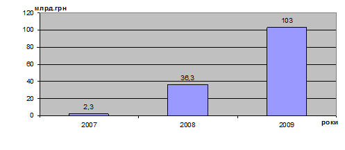 Як ми бачимо, загальна сума державного боргу значно зростала з року в рік. Аналізуючи структуру боргу, видно, що найбільшого зростання досягає сааме зовнішній борг, як прямий так і гарантований. Так, прямий зовнішній борг зріс з 53,5 млрд. грн у 2007 році до до 135,9 у 2009 році, тобто збільшився на 82,4 млрд. грн, або на 154,1%. Аналогічний показник по гарантованому боргу зріс із 16 млрд. грн. до 75,8 млрд. грн. за відповідний період, тобто зростання абсолютного показника становить 59,4 млрд. грн., а у відносному розрахунку він дорівнює 361%. Одним з факторів, який мав вагомий вплив на даний процес, стало падіння курсу гривні через світову фінансову кризу. Перевищення фактичного обсягу державного боргу над граничним становить 18,2 млрд. грн. і спричинене стрімким зростанням курсів іноземних валют: так на початок 2008 року офіційний курс становив 5,05 гривні за дол. США, а на 31 грудня 2008 року – 7,7 гривні за дол. США. Таке падіння національної валюти, спричинене негативним впливом світової фінансової кризи, не було передбачено державним бюджетом, показники якого розраховані виходячи із прогнозного курсу 5,1 гривні за дол. США. В 2009 році державний борг також суттєво збільшився (на 67,3% порівняно з 2008 році). Державний борг України становив 227 млрд. грн. (71,63%) або 28 млрд. дол. США. Статтею 11 Закону України «Про Державний бюджет України на 2009 рік» встановлений граничний розмір державного боргу України в сумі 193,1 млрд. грн. Перевищення фактичного обсягу державного боргу над граничним становить майже 34 млрд. грн. і спричинене як здійсненням державних запозичень відповідно до статті 85 в сумі більшій ніж передбачено додатком №2 до Закону України «Про Державний бюджет України на 2009 рік», так і зростанням фактичних курсів іноземних валют порівняно із прогнозними, що застосовувались при плануванні державного бюджету (збільшення державного боргу за рахунок курсових різниць становить близько 3,0 млрд. грн. або 3% зростання державного боргу), а також віднесенням на державний борг України коштів МВФ, отриманих Україною в результаті спеціального розподілу СПЗ в сумі 1,228 млрд. СПЗ (або 15,7 млрд.грн.). Детальніші дані про державний борг України за 2007 – 2009 роки відображено в додатках А-В. Важливим є той факт, що з 2007 року по 2009 значно зріс державний борг за ставкою МВФ (від 2,178 млрд. грн. до 102,998 млрд. грн.). Ця ситуація ситуація пояснюється тим, що з настанням фінансової кризи уряд почав залучати кредити МВФ для збереження стабільності банківського сектору країни та стабілізації національної валюти. Також частина цих коштів використовувалась і для покриття державного боргу. Цю динаміку проілюстровано на рис.2.1.