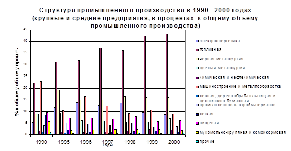 Динамика производства важнейших видов промышленной продукции в 1990-2000 годах (крупные и средние предприятия), в натуральном выражении, в процентах к уровню 1990 года