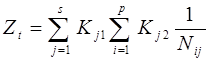 Кj1 – коефіцієнт, який враховує вплив напружень попереднього рівня на напруження даного (К11 =1); Кj2 – коефіцієнт, який враховує нерівномірність амплітуд у часі всередині рівня. Якщо прийняти в першому наближенні всі Кj =1, то дане рівняння буде відповідати рівнянню Майнера. Тому основну увагу слід приділити визначенню Кj . Суть пропонованих коефіцієнтів полягає у виділенні найбільш суттєвих ознак реального процесу широкосмугового навантажування. Згідно з розробленим методом схематизації напружень реальний процес навантажування моделюється циклами еквівалентних напружень, приведеними до окремих рівнів з різною частотою. Визначення К21 , К31 і т.д. можна провести згідно з аналізу двочастотних процесів, де накопичено вже значну кількість інформації. У загальному випадку для визначеного матеріалу Кj1