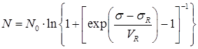 =3767600; V=15,5 МПа; Для визначення залишкового ресурсу КНШ у типових умовах експлуатації проведено експериментальні випробування насосних штанг з різним корозійно-втомним пошкодженням: нових, після 4 і після 8 років експлуатації. Генеральну вибірку експериментальних даних наведено на рис. 9. У результаті обробки з допомогою розробленої методики отримано такі параметри усередненої кривої втоми (рис. 9) у вигляді (10-12):