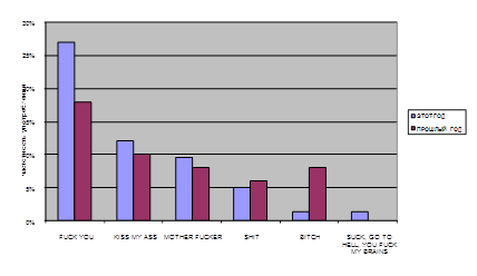 Второй год мы встречаемся с показательным явлением – анкетируемые легко написали нецензурные англицизмы на английском языке, а по-русски постеснялись, заменили выразительным многоточием. Динамика частотности употребления и лексического состава нецензурных и вульгарных англизмов отражена на рисунке 1.