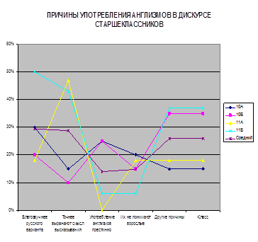 Рисунок 2 – Причины употребления англизмов в дискурсе старшеклассников Юноши 10 (физико-математического) употребляют неологизм «you fuck my brains» – и есть основания предполагать, что его использование в дискурсе старшеклассников гимназии будет более долговечным, поскольку он не имеет гендерной окраски и в его состав входит слово «brains» – «мозги», «ум», то есть этот вульгаризм помогает выразить интеллектуальную усталость, посетовать на «мозговые перегрузки», что часто актуально для учащихся гимназических классов. Хотя, конечно, гимназисты знают русские фразеологизмы и устойчивые выражения, помогающие сделать то же самое: «голова кругом идет», «мозги плавятся», «голова забита». Но такова особенность молодежного дискурса, что среди его социальных средств «допускаются, например, вульгаризмы, жаргон, стеб» [3. с.9]. И мы предполагаем следующее: в данной ситуации вульгаризмы английского происхождения играют роль «более мягких» заменителей русской нецензурной лексики, что тоже характеризует выпускников нашей гимназии с положительной стороны, свидетельствует о стойком уважении старшеклассников к русскому слову. Этот вывод подтверждается и наличием в каждом классе учащихся, которые считают, что не употребляют англизмы, так как «в русском языке достаточно слов», «американцы всё пытаются нам навязывать – нужно сопротивляться», «надо любить родной язык» (из ответов на вопросы анкеты). ЗАКЛЮЧЕНИЕ Собранный в ходе работы материал, его анализ позволяет сделать следующие выводы: Привлекательность англизмов для стремящейся к андрогинии личности выпускника нашей гимназии частично объясняется отсутствием категории рода в английском языке. Обнаруживается тесная взаимосвязь между гендерной картиной класса и используемыми в нем англизмами: в коллективах, ведущих «войну полов», представители каждого гендера пользуются преимущественно англизмами разных тематических групп; в классах, где идет «война полов», вульгаризмы английского происхождения используют представители обоих гендеров, а в классах с определенным лидерством – представители доминирующего гендера; в классах с определенными властными отношениями представители обоих гендеров используют преимущественно лексику межличностного общения (междометия и существительные), термины и понятия, связанные с миром компьютеров, вульгаризмы и нецензурную лексику. Анализ англизмов дискурса старшеклассников-гимназистов в гендерном «измерении» помогает определить некоторые особенности формирования мышления и ментальности гимназистов 10 – 11 классов гимназии: в представлении большинства старшеклассников использование нецензурной лексики – одна из ярких характеристик маскулинности, а в практике употребления англизмов эта черта присуща представителям обоих гендеров; учащиеся всех классов используют нецензурную английскую лексику и вульгаризмы в качестве своеобразного «более мягкого», в их представлении, заменителя русской; особенности словоупотребления англизмов в дискурсе выпускников свидетельствуют о стойко сформированном в их менталитете уважении к письменной русской речи и осторожности в обращении с ней; по-прежнему в основе речевого поведения выпускников гимназии лежит воспитанная в первую очередь учителями убежденность в красоте и богатстве русского языка, вос