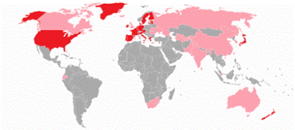 Рисунок 1- Карта распространения мирового финансового кризис в 2008 году: На рисунке 1 видно, что кризис затронул все экономически развитые страны. Особо остро он отразился в США и Европейских странах. Латинская Америка и страны Африки остались незатронутыми кризисом вовсе. Начавшись с проблем крупнейших компаний США, кризис быстро перерос в мировой финансовый кризис, здесь сработал «принцип домино» (рис. 1). Одним из символов мирового финансового кризиса стал крах американского банка Lehman Brothers. В Европе первой ласточкой мирового финансового кризиса в 2008 году стал скандал вокруг банка Société Générale(Сосьете женераль), который в результате мошенничества своего трейдера потерял 5 млрд. евро на биржевых торгах. Нынешний финансовый кризис отличается как глубиной, так и размахом - он, пожалуй, впервые после Великой депрессии охватил весь мир. «Спусковым крючком», приведшим в действие кризисный механизм, стали проблемы на рынке ипотечного кредитования США. Однако в основе кризиса лежат более фундаментальные причины, включая макроэкономические, микроэкономические и институциональные. Ведущей макроэкономической причиной оказался избыток ликвидности в экономике США, что, в свою очередь, определялось многими факторами, включая: - общее снижение доверия к странам с развивающимся рынком после кризиса 1997-1998 гг.; - инвестирование в американские ценные бумаги странами, накапливающими валютные резервы (Китай) и нефтяные фонды (страны Персидского залива); - политику низких процентных ставок, которую проводила ФРС в 2001-2003 гг., пытаясь предотвратить циклический спад экономики США. Под влиянием избыточной ликвидности активизировался процесс формирования рыночных пузырей - искаженной, завышенной оценки различных видов активов. В отдельные периоды такие пузыри формировались на рынках недвижимости, акций и сырьевых товаров, что стало важной составной частью кризисного механизма. Согласно данным межстрановых исследований, охватывавших длительные временные периоды, кредитная экспансия является одним из типичных условий финансовых кризисов. Таким образом, риски развития кризиса в результате ослабления денежно-кредитной политики, реализовавшиеся в 2007-2008 гг., - не исключение, а общее правило. На этом фоне способствовали наступлению кризиса и микроэкономические факторы - развитие новых финансовых инструментов (прежде всего структурированных производных облигаций). Считалось, что они позволяют снизить риски, распределяя их среди инвесторов и обеспечивая правильную оценку. На самом деле использование производных инструментов фактически привело к маскировке рисков, связанных с низким качеством субстандартных ипотечных кредитов, и к их непрозрачному распределению среди широкого круга инвесторов. Наконец, в числе институциональных причин отметим недостаточный уровень оценки рисков как регуляторами, так и рейтинговыми агентствами. Мягкая денежно-кредитная политика, проводившаяся ФРС США с начала 2000-х годов, стимулировала выдачу банками кредитов. Среднегодовые темпы прироста банковского потребительского кредитования в 2003-2007 гг. были на уровне 5%, прирост потребительских кредитов в III квартале 2007 г. составил 7,2%. Объем выданных ипотечных кредитов возрос с 238 млрд долл. в I квартале 2000 г. до 1199 млрд долл. в III квартале 2003 г. По мере вхождения эконом