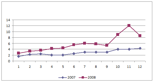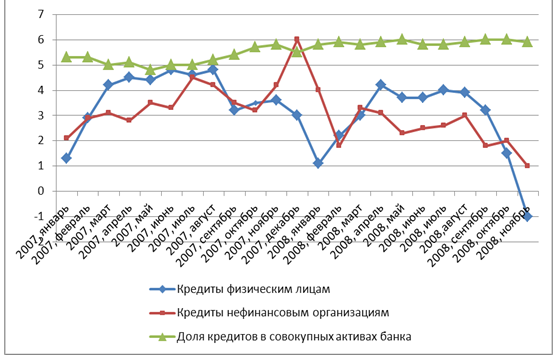 Рисунок 7 - Денежная масса М2 (прирост, в % к началу 2008 года) В условиях нехватки «длинных» денег банки вынуждены в качестве источника формирования «длинных» активов использовать «короткие» обязательства. Причем эта ситуация характерна не только для периода текущей финансовой нестабильности, но и для последних нескольких лет, когда краткосрочные обязательства покрывали не менее 10 - 14% долгосрочных активов банков. Очевидно, дальнейшее наращивание долгосрочных кредитов за счет краткосрочных пассивов могло негативно сказаться на ликвидности банковской системы. В последнее время замедление темпов роста кредитного портфеля приняло ярко выраженный характер. В ноябре 2008 г. по сравнению с октябрем объем выданных кредитов населению даже сократился на 0,7%, прирост банковских кредитов предприятиям составил всего 0,7% (см. рис. 8). По итогам одиннадцати месяцев 2008 г. задолженность перед кредитными организациями нефинансовых организаций выросла на 32,6% против 46,9% за тот же период 2007 г. На динамику банковских кредитов в 2008 г. оказало влияние и то, что в период кризиса многие организации начали сворачивать инвестиционные программы, сокращать текущие расходы. Банки стали ужесточать требования к финансовому состоянию граждан в связи с возрастающими рисками непогашения кредитов (снижение покупательской способности, увеличение числа безработных). В ближайшее время банкам придется больше внимания уделять привлечению ресурсов с внутреннего рынка.