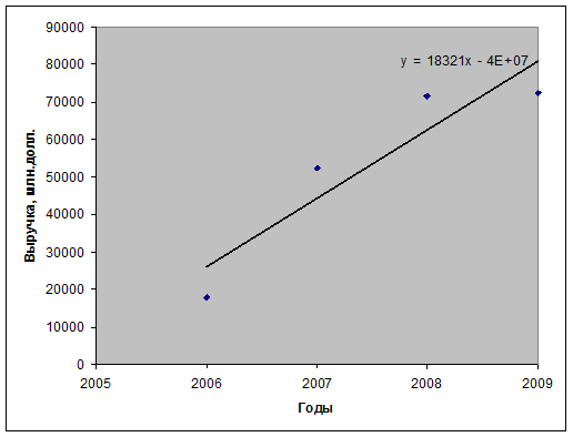 Рисунок 1 – График тренда выручки На основании полученного уравнения у=18321х-4Е+07 спрогнозируем выручку на 2010-2014гг.: 2010г. – 18321*5-4Е+08= 91 601 млн.долл. 2011г. – 18321*6-4Е+08= 109 922 млн.долл. 2012г. – 18321*7-4Е+08= 128 243 млн.долл. 2013г. – 18321*8-4Е+08= 146 564 млн.долл. 2014г. – 18321*9-4Е+08= 164 885 млн.долл. Прогноз чистой прибыли ОАО ОАО «Компания М.Видео». Рассчитаем коэффициент рентабельности торговой сети, представив данные таблицей 3. Таблица 3 – Рентабельность ОАО «Компания М.Видео»