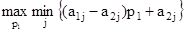 смешанная стратегия для первого игрока Р = смешанная стратегия для второго игрока Q = цена игры n = 4.2.3 Решение задачи графическим методомСимплекс-методом можно найти решение матричной игры произвольной размерности. Графическим же способом найти решение можно лишь для игры размерности 2 х n. В ответе мы должны получить смешанные стратегии – два вектора PA = (p1, p2) и QB = (q1, q2, …, qn). Причем, p2 = 1 – p1. В этом случае выигрыш игрока А, соответствующий j-той чистой стратегии игрока В, будет вычисляться по формуле: aj* = a1j p1 + a2j p2 = a1j p1 + a2j (1 – p1) = (a1j – a2j) p1 + a2j Нахождение наименьшего гарантированного выигрыша для игрока А подразумевает минимизацию данного выражения. По условию наша игра имеет размерность 2 х n. То есть j = a = Решим графическим способом предыдущий числовой пример.
