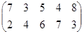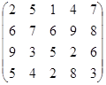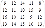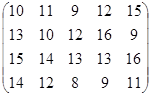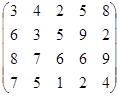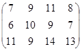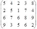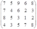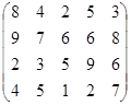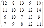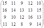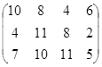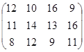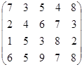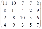 PA = (p1, p2, …, pm)– это оптимальная смешанная стратегия первого игрока. То есть нужно так подобрать (p1, p2, …, pm) , чтобы n была как можно большей. Или же, что то же самое, чтобы Таким образом, используя новые переменные и учитывая всё вышесказанное, исходную матричную игру можно представить в виде задачи линейного программирования: найти вектор переменных Х = {x1, x2, … , xm}, такой что: целевая функция f = при множестве ограничений: АТХ ≥ Е гдеА – матрица коэффициентов (платежная матрица), заданная в условии; Е – единичный вектор Х – вектор неизвестных переменных, такой что xi = n – это цена игры:n = рi – это коэффициенты вектора смешанной стратегии первого игрока. 4.2.2 Решение задачи симплекс-методомРассмотрим числовой пример. Пусть имеем игру с платежной матрицей: