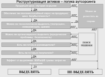 Рис. 1.1. Схема перехода на аутсорсинг 1. Критерии определения насколько стратегическая позиция компании по отдельному виду операции являются уникальными для каждой организации и подвержены субъективному восприятию менеджеров. 2. «Реорганизовать» - возможно, в краткосрочном периоде отдать на аутсорсинг, но в долгосрочном периоде должно быть возвращено под контроль компании. 3. ? (Необходимо обсуждать) - много возможных решений: продажа, расширение и предоставление услуг другим организациям, аутсорсинг, расширение профиля и создание стратегического конкурентного преимущества. В рамках реализации проектов реструктуризации компаний и перехода производств на аутсорсинг выбран следующий алгоритм принятия решения о выводе подразделения компании на аутсорсинг (рис. 1.2).
