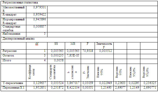 Проведем корреляционно-регрессионный анализ для определения тесноты связи производительности труда и фондовооруженности. Расчет произведем в помощью MSExcel. Результаты анализа представлены в таблице 12. Таблица 12 – Результаты корреляционно-регрессионного анализа