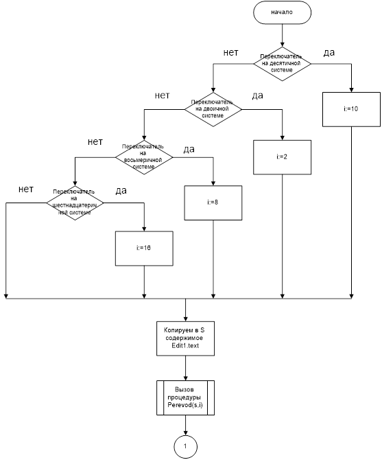 Блок-схема процедуры inputss 2.3 Используемые технические средстваПри выполнении данной курсовой работы используется персональный компьютер поколения Intel. Данный компьютер оснащен всеми устройствами необходимыми для работы в среде разработки Delphi 7, и последующем запуске полученных программ. 2.4 Вызов и загрузкаПрограмма №1 начинает свою работу при запуске приложения с именем «perevod.exe». 2.5 Входные данныеДля программы входными данными являются строка edit1.text и переключатели radiobutton1, radiobutton2, radiobutton3, radiobutton4. 2.6 Выходные данныеВ программе выходными данными будет являться строка label1.caption. 3. Программа и методика испытаний3.1 Объект испытанийОбъектами испытаний являются три разработанных приложения: perevod.exe. 3.2 Цель испытанийЦелью испытаний данных приложений является выяснение возможных ошибок во время выполнения программы, которые не были обнаружены на стадии разработки. 3.3 Требования к программеПрограммы должны надежно работать и выполнять свои функции при любых возможных наборах исходных данных, выдавая результат за конечное время. 3.4 Требования к программной документацииТехническое задание – ГОСТ 19.201–78 Программа и методика испытаний – ГОСТ 19.301–79 Текст программы – ГОСТ 19.401–78 Описание программы – ГОСТ 19.402–78 3.5 Средства испытанийДля проведения испытаний используется IBM-совместимый персональный компьютер с операционной системой семейства Windows. 3.6 Методы испытаний· Входные данные: строка: «» переключатель: десятичная Результат: сообщение «пустая строка» · Входные данные: строка: «12345q» переключатель: десятичная Результат: сообщение «неверный завершающий символ» · Входные данные: строка: «ffffffffh» переключатель: десятичная Результат: сообщение «превышение допустимого диапазона» · Входные данные: строка: «123nv23» переключатель: десятичная · Результат: сообщение «строка введена не корректно» · Входные данные: строка: «012345» переключатель: десятичная · Результат: сообщение «строка начинается с нуля» · Входные данные: строка: «12345» переключатель: десятичная · Результат: 12345 · Входные данные: строка: «12345» переключатель: двоичная · Результат: 11000000111001b · Входные данные: строка: «12345» переключатель: восьмеричная · Результат: 30071o · Входные данные: строка: «12345» переключатель: шестнадцатеричная · Результат: 3039h · Входные данные: строка: «12345h» переключатель: десятичная · Результат: 74565 · Входные данные: строка: «12345h» переключатель: двоичная · Результат: 10010001101000101b · Входные данные: строка: «12345h» переключатель: восьмеричная · Результат: 221505o · Входные данные: строка: «12345h» переключатель: шестнадцатеричная · Результат: 12345h · Входные данные: строка: «12345o» переключатель: десятичная · Результат: 5349 · Входные данные: строка: «12345o» переключатель: двоичная · Результат: 1010011100101b · Входные данные: строка: «12345o» переключатель: восьмеричная · Результат: 12345o · Входные данные: строка: «12345h» переключатель: шестнадцатеричная · Результат: 14E5h · Входные данные: строка: «1011001010b» переключатель: десятичная · Результат: 714 · Входные данные: строка: «1011001010b» переключатель: двоичная · Результат: 1011001010b · Входные данные: строка: «1011001010b» переключатель: восьмеричная · Результат: 1312o · Входные данные: строка: «1011001010b» переключатель: шестнадцатеричная · Результат: 2CAh 4. Руководство оператора (пользователя) 4.1 Назначение и условия применения программ Программа служит для перевода