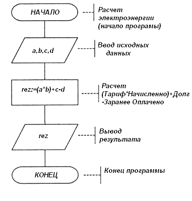 ФЕДЕРАЛЬНОЕ АГЕНСТВО ПО ОБРАЗОВАНИЮ Государственное образовательное учреждение высшего профессионального образования Находкинский инженерно-экономический институт (филиал) Дальневосточного государственного технического университета (ДВПИ имени В.В. Куйбышева) Кафедра: Прикладная информатика Курсовая работа по дисциплине «Программирование на языках высокого уровня» Тема: «Разработка и реализация программы расчета платежа за электроэнергию» Находка 2010 Введение Цель курсовой работы - обобщение, закрепление и углубление знании, полученных за время изучения дисциплины; - получение практических навыков подготовки инженерно-технических задач к решению на компьютере (ПК); - ознакомление с наиболее распространёнными методами обработки информации при решении прикладных задач; - закрепление навыков работы в Pascal; - получение навыков в использовании научно-технической и нормативной литературы, ГОСТов; - приобретение опыта в оформлении текстовых и графических материалов курсовых работ. 1. Задание на курсовую работу Задание: разработать и реализовать программу расчета платежей за потребленную электроэнергию. Информация (ФИО, адрес, дата, тариф, начислено, долг, заранее оплачено) должна вводиться пользователем. Программа должна корректно воспринимать данные, а также обрабатывать их с целью получения полной информации о предстоящем платеже за электроэнергию с учетом как тарифа и текущих начислений, так и с учетом долга и заранее погашенных платежей. 2. Постановка задачи Исходные данные: Тариф (а), начислено (b), долг (с), заранее оплачено (d). Результаты: Результат (rez). Операции: Результат(rez):=(тариф(а)*начислено(b))+долг(с)-заранее оплачено(d). 3. Математическая модель задачи Пусть РЕЗУЛЬТАТ будет равен x. Тариф обозначим как переменную а, начислено обозначим как переменную b, долг обозначим как переменную с, а заранее оплачено обозначим как переменную d. Так как РЕЗУЛЬТАТ равен (тариф*начислено)+долг-заранее оплачено то в формульном виде это будет выглядеть следюющим образом: X:=(a*b)+c-d 4. Блок-схема алгоритма программы
