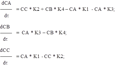 5. Программа PROGRAM smith_04;USES crt; VAR i,n:integer; sum,k1,k2,k3,k4,p,dp,eps,Xn,Xk,X,dX:real; rSR,C,dC,r1,r2,r3,r4,cPR:array[1..3] of real; f1,f2:text; PROCEDURE Difur; BEGIN dC[1]:=C[3]*k2+C[2]*k4-C[1]*k1-C[1]*k3; {dcA} dC[2]:=C[1]*k3-C[2]*k4; {dcB} dC[3]:=C[1]*k1-C[3]*k2; {dcC} END; PROCEDURE RK_4; BEGIN Difur; FOR i:=1 TO n DO BEGIN r1[i]:=dC[i]; C[i]:=cPR[i]+r1[i]*(dX/2); END; Difur; FOR i:=1 TO n DO BEGIN r2[i]:=dC[i]; C[i]:=cPr[i]+r2[i]*(dX/2); END; Difur; FOR i:=1 TO n DO BEGIN r3[i]:=dC[i]; C[i]:=cPR[I]+r3[i]*dX; END; Difur; FOR i:=1 TO n DO r4[i]:=dC[i]; FOR i:=1 TO n DO rSR[i]:=((r1[i]+r2[i])*(r2[i]+r3[i])*(r3[i]+r4[i]))/6; END; PROCEDURE STROKA; BEGIN WRITE(f2,'|',x:4:1,'|',c[1]:7:3,'|',c[2]:7:3,'|',c[3]:7:3,'|'); WRITE(f2,sum:3:0,'|',dc[1]:7:3,'|',dc[2]:7:3,'|',dc[3]:7:3,'|'); WRITELN(f2); END; PROCEDURE RUN; BEGIN WRITE('Step 3: Calculating data and writting results to file : out.rez'); X:=Xn; dX:=0.05; REPEAT IF (ABS(x-p)<eps) THEN BEGIN Difur; sum:=C[1]+C[2]+C[3]; STROKA; p:=p+dp; END; FOR i:=1 TO n DO Cpr[i]:=C[i]; RK_4; X:=X+dX; UNTIL(X>Xk); WRITELN(' - done.'); END; PROCEDURE INIT; BEGIN ClrScr; WRITELN('Smith-04: v1.0 (c) 1998 by Mike Smith smith01@home.bar.ru '); WRITELN; WRITELN; WRITE('Step 1: Read data from file : in.dat'); ASSIGN(f1,'in.dat'); RESET(f1); READLN(f1,C[1],C[2],C[3]); READLN(f1,k1,k2,k3,k4); READLN(f1,Xn,Xk,dp,n,eps,p); WRITELN(' - done.'); ASSIGN(f2,'out.rez'); REWRITE(f2); WRITE('Step 2: Write header to file : out.rez'); WRITELN(f2,''); WRITELN(f2,'| t,c| Ca,% | Cb,%| Cc,% | SUM | dCa | dCb | dCc |'); WRITELN(f2,'='); WRITELN(' - done.'); END; PROCEDURE DONE; BEGIN WRITELN('Step 4: Close all files and exiting...'); CLOSE(f1); WRITELN(f2,'='); CLOSE(f2); WRITELN; END; BEGIN INIT; RUN; DONE; END. 6. Идентификация переменных Таблица 1