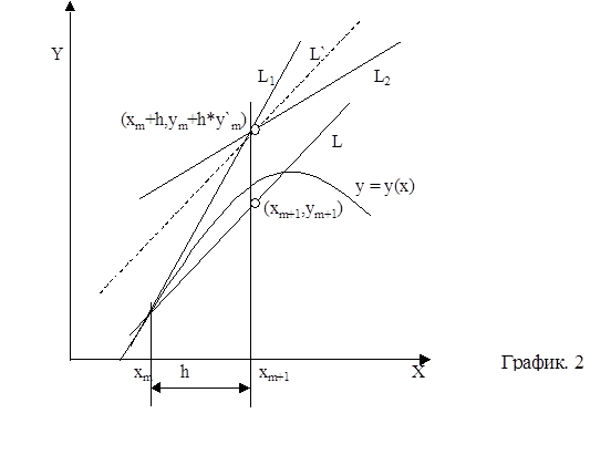 Для преобразования данных дифференциальных уравнений для использования их в расчетах тепловых и кинетических схем методами Рунге-Кутты необходимо подставлять вместо производных значений концентраций, значения концентраций данных в начале процесса. Это обусловлено тем, что метод Рунге-Кутты четвертого порядка, который будет использован для расчета кинетической схемы процесса. Так как этот метод требует сведений только об одной точке и значений функции. 2. Суть метода Разбор и рассмотрение методов, применяемых на практике для решения дифференциальных уравнений, мы начнем с их широкой категории, известной под общим названием методов Рунге-Кутта. Методы Рунге-Кутта обладают следующими свойствами: 1. Эти методы являются одноступенчатыми: чтобы найти уm+1 , нужна информация о предыдущей точке xm , ym . 2. Они согласуются с рядом Тейлора вплоть до членов порядка hp , где степень р различна для различных методов и называется порядковым номером или порядком метода . 3.Они не требуют вычисления производных от f (x , y) , а требуют вычисления самой функции . Рассмотрим сначала геометрическое построение и выведем некоторые формулы на основе геометрических аналогий. После этого мы подтвердим полученные результаты аналитически. Предположим, нам известна точка xm,ym на искомой кривой. Тогда мы можем провести прямую линию с тангенсом угла наклона у¢m =f(xm ,ym ), которая пройдет через точку xm ,ym . Это построение показано на рис.1, где кривая представляет собой точное, но конечно неизвестное решение уравнения, а прямая линия L1 построена так, как это только что описано.